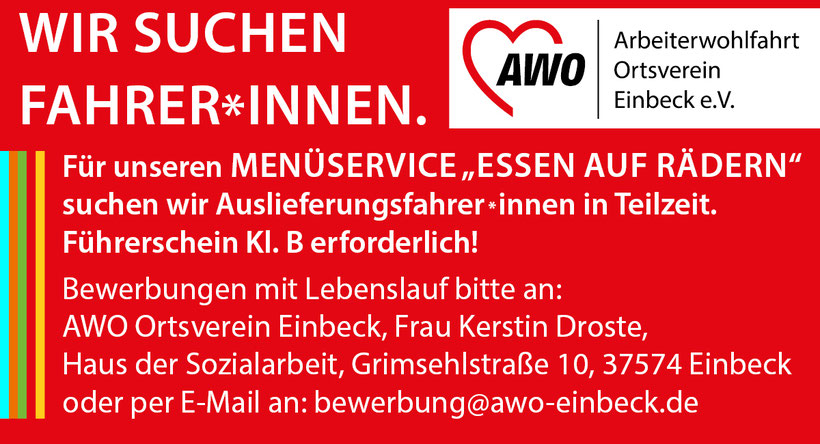 Bitte richten Sie Ihre Bewerbung an die Geschäftsstelle, AWO-Haus der Sozialarbeit, Grimsehlstraße 10, 37574 Einbeck.